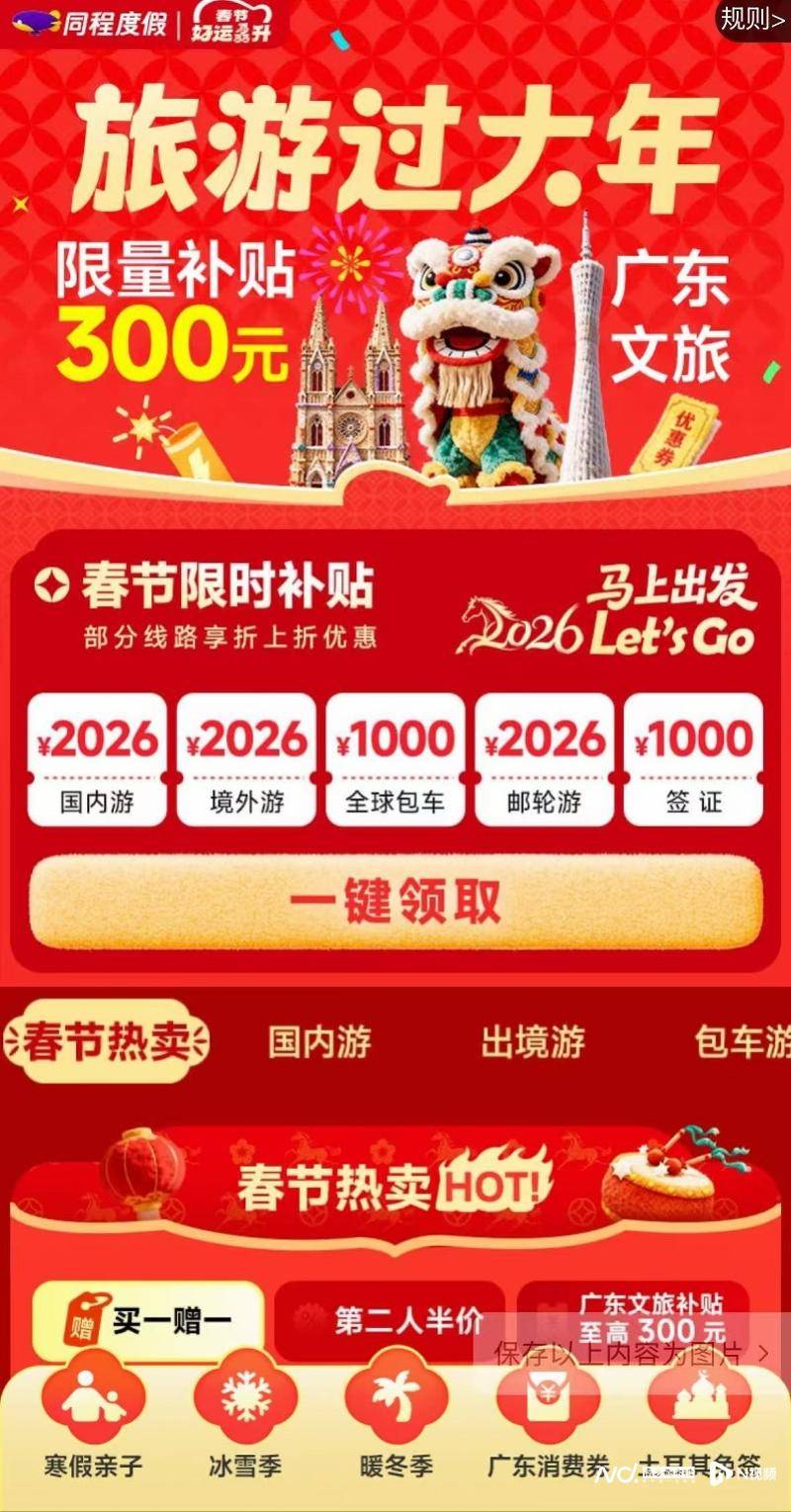 即日起至2026年3月31日,同程旅行APP及小程序专题页面推出多重尊享礼遇:新春锦鲤礼涵盖全品类的专属券包,与广东文旅消费券叠加使用,享折上折优惠。